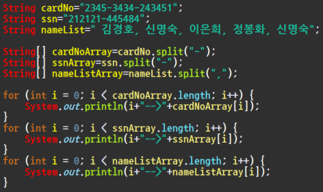 - split() 연속되는 부분에 대해 ()안에 연속되는 문자를 넣은 후 출력 시 해당 부분 순서대로 노출