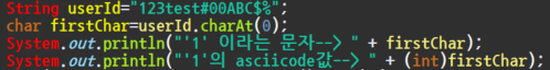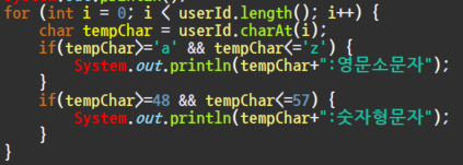 * for문을 활용하여 userId.charAt(i)를 char 형변환 하여 영어소문자(a~z), 숫자형문자(48~57) 비교