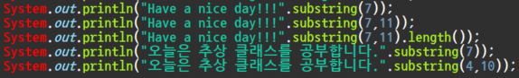 - (int beginindex, int endindex) 괄호 안에 시작 & 끝 수를 넣으면 시작~끝 글자 출력