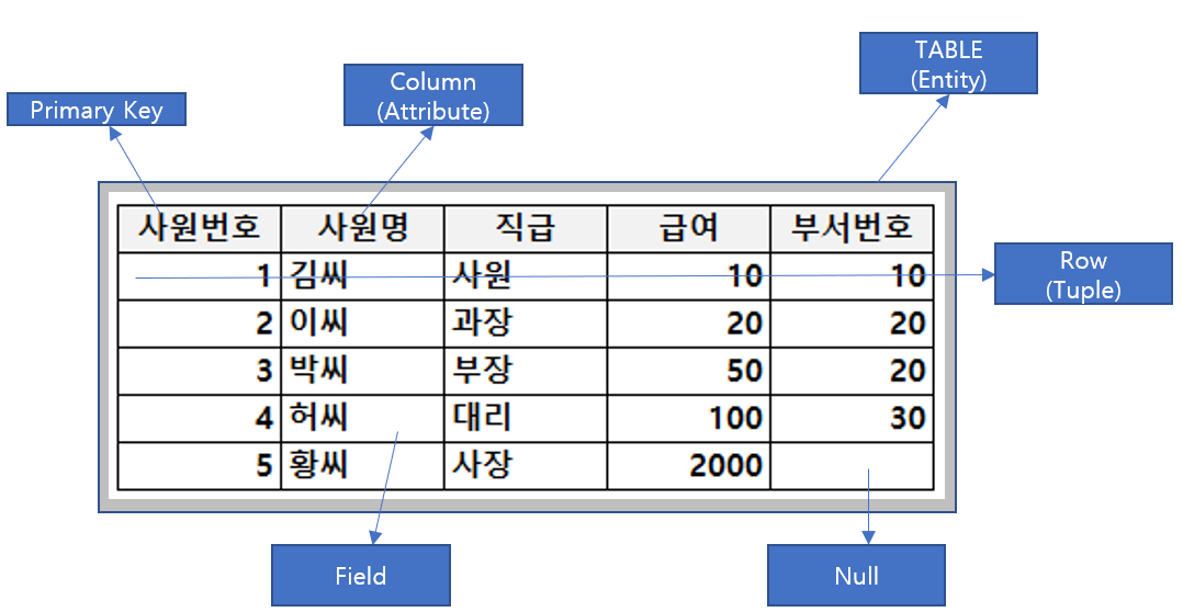 - 하나의 Row는 서로 구분되는 속성으로 구성되며 (사원번호, 사원명, 직급, 급여, 부서번호 등이 Column)