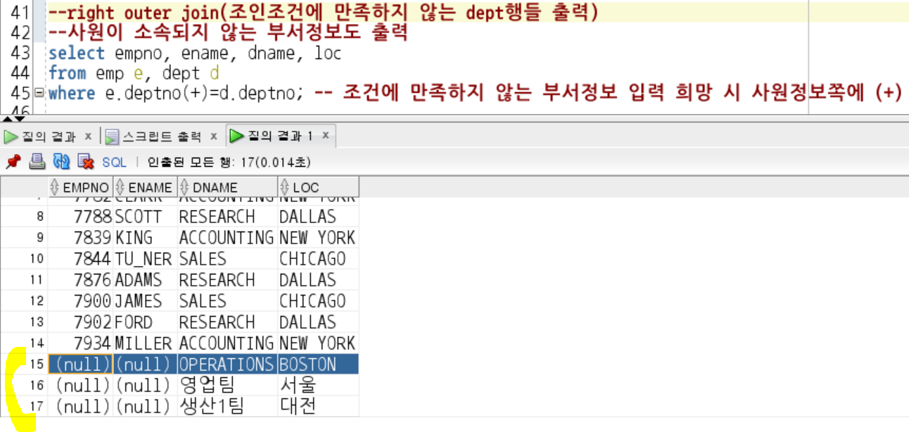 -> 조인 조건에 만족하지 않은, 누락된 행까지 포함하여 출력