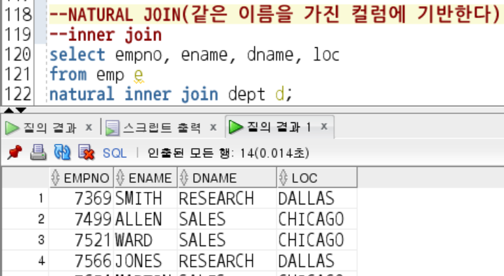 -> Equi-Join과 동일, 같은 이름을 가진 컬럼에 기반