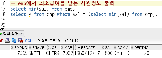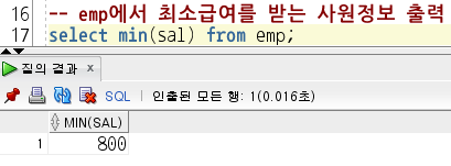 (1) SELECT MIN(SAL) FROM EMP; -> 검색 시 emp 테이블에서 min(sal)의 값은 800