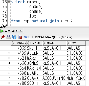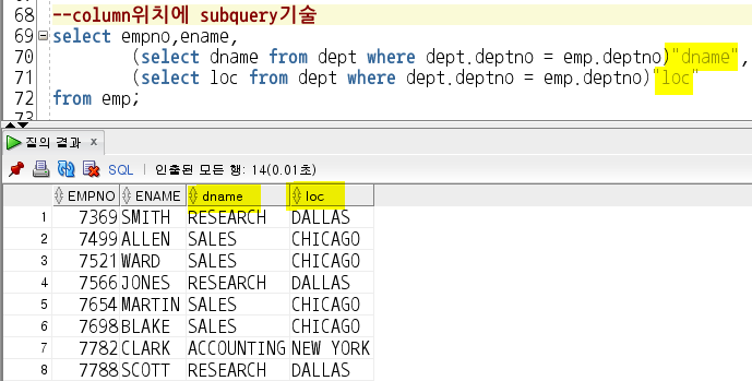 (1) column에 subquery를 주어서 dept 테이블과 emp 테이블 사이의 PK와 FK가 일치하는 항목들을 노출시킴