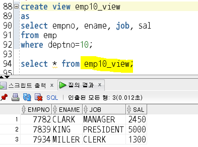 (1) emp 테이블의 deptno가 10인 Temporary VIEW(emp10_view) 생성 후 from절 출력