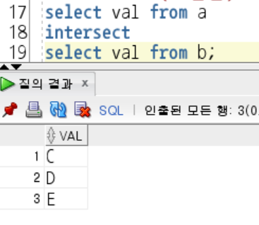 - INTERSECT: 각각의 쿼리에 공통적으로 포함되어 있는 행 출력 (교집합)