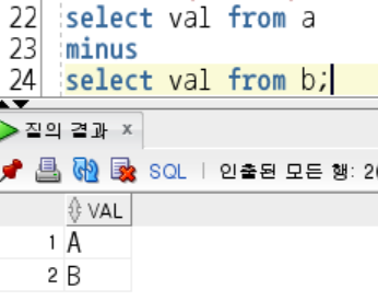 --> MINUS 사용 시 첫 번째 쿼리 결과에서 두 번째 쿼리 결과 행 제거 후 출력