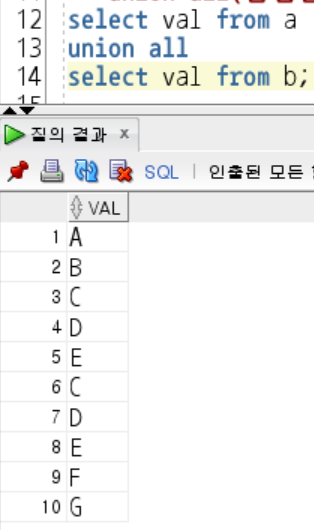 - UNION ALL: 각 쿼리에 의해서 선택 된 모든 결과를 출력, 중복 허용
