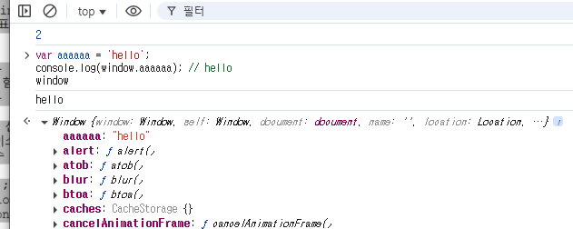 위에 이미지를 보면 aaaaaa를 콘솔에서 선언하니까 얘가 Window에 선언이 된 것
